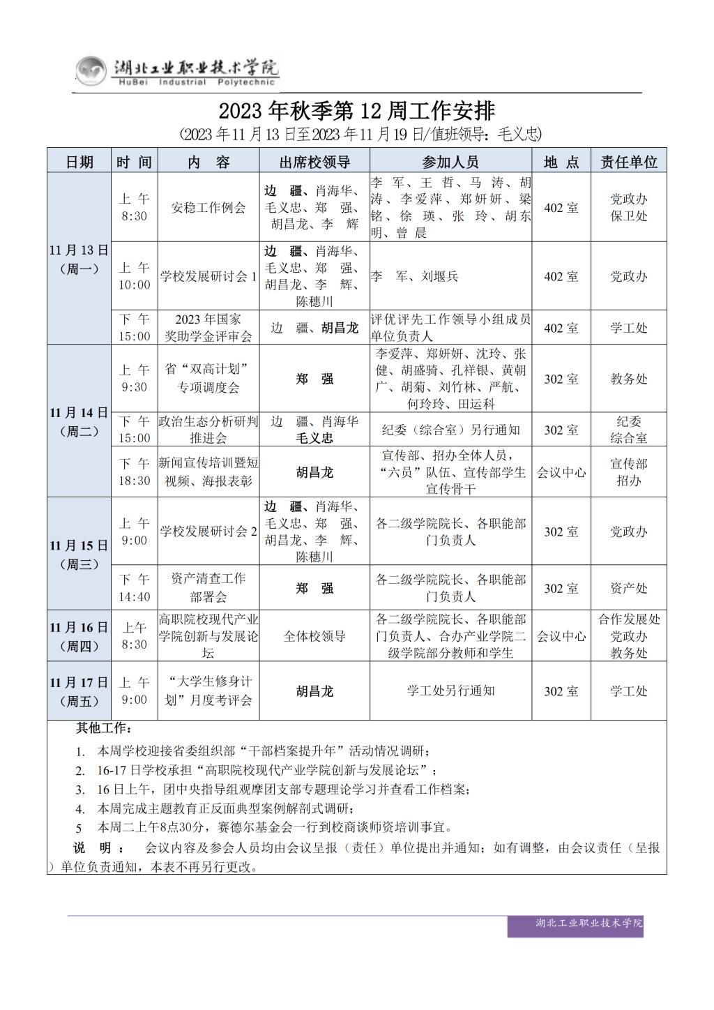 2023年秋季第12周工作安排