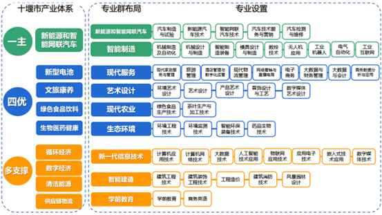 指导思想:坚持“服务区域经济、助推产业升级、成就师生梦想”的办学理念,深入实施“五化同步”(本土化、一体化、精准化、智慧化、国际化)发展战略,紧密对接湖北省“51020”(湖北制造打造5个万亿级支柱产业、10个五千亿级优势产业、20个千亿级特色产业集群)现代产业体系战略布局,全力服务十堰市“一主四优多支撑”产业体系,有力支撑“绿色低碳发展示范区”建设。