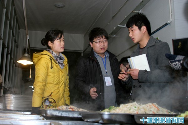 师生一行走访了嘉园1号宿舍楼,宿管中心配电室,医务室,南、北区食堂、超市,参观了食堂储藏室及操作间,通过工作人员的介绍,详细了解了食堂饮食安全保障措施,宿舍水、电收费系统运行情况,医务室药品划价和超市经营情况,并就一些校内消费行为中碰到的疑惑与工作人员进行了沟通。