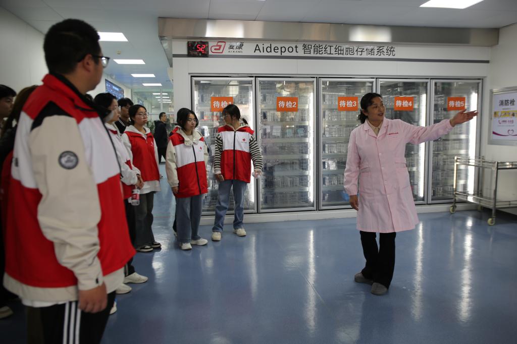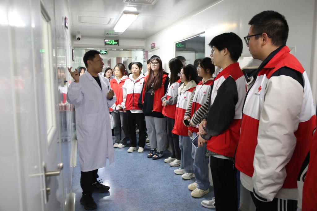 随后,在血站讲解员的引导下,同学们走进血站的“心脏”地带,沿着“爱心血液”的轨迹,进行了一次零距离的探秘之旅。从登记征询区的严谨细致,到体检初筛区的严格把关;从血液采集区的温馨舒适,到待检库的短暂停留;最终抵达最为神秘的血液制备实验室、检验科和储血库。“以前只知道献血是好事,但今天才真正明白,一袋血从采集到输入患者体内,竟要经历如此复杂而严谨的‘生命旅程’。每一个环节都凝聚着科学、责任与关爱。”志愿服务队队员区金妮同学在参观后感慨道。